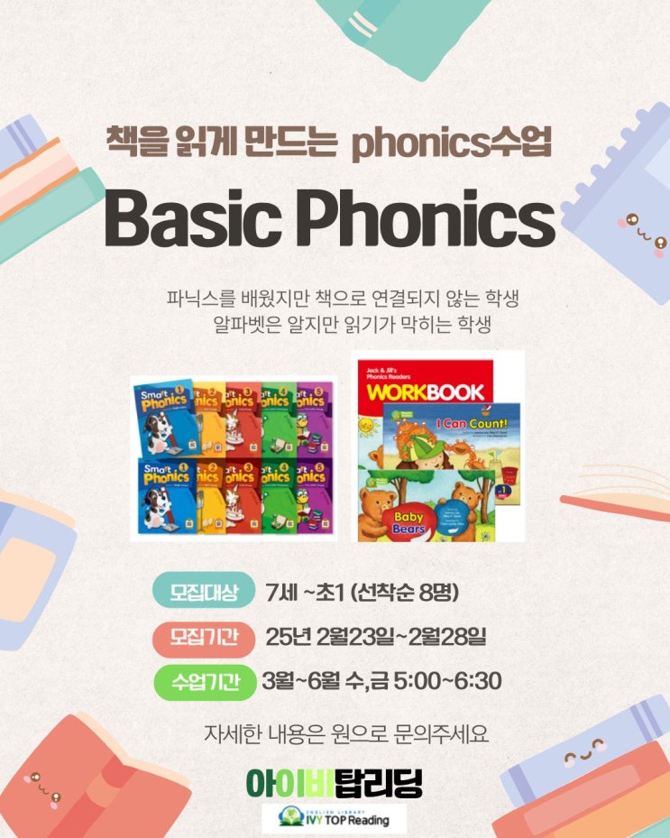 안녕 하세요 "최상위 1%를 위한 IVY 아이비 탑리딩 & DUX 덕스 어학원 입니다." 읽기가 시작되는 4개월 파닉스로 ‘책을 읽게 만드는’ 4개월 완성 특강입니다.” 파닉스 → 리딩까지 한 번에 연결하는 주 2회 영어독서 특강 프로그램 ◆ 신청: https://forms.gle/i715HEoEJkRZLH9Z9 ◆ 이런 학생에게 추천합니다 • 알파벳은 알지만 읽기가 막히는 학생 • 파닉스를 배웠지만 책으로 연결되지 않는 경우 ◆ 특강 구성 • 기간: 4개월 과정 • 횟수: 주 2회 (총 32회) • 수업 시간: 수,금 5:00-6:30 /회당 90분 ( 매시간 소설책 집중 듣기 진행) • 8명 정원 / 선착순 마감 ◆ 사용 교재 • Smart Phonics 1–5 • Jack & Jil....... <img src="https://blogthumb.pstatic.net/MjAyNjAyMTNfMTg1/MDAxNzcwOTYxMTM1NzEy.pbnOpBr52_SUonSPEfUq6Enwlr8mVk0M4liNahVUDNQg.5L81jRuO5Bx6NsmL3OQ32queuxIx-UzUrwoPhTOc3vAg.JPEG/%C6%AF%B0%AD_-%C6%C4%B4%D0%BD%BA.jpg?type=s3" />
