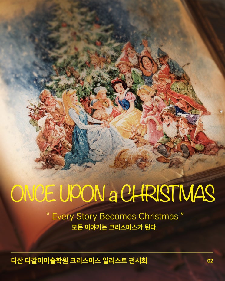 다산 다같이미술학원 2026 크리스마스 일러스트 전시회 ONCE UPON A CHRISTMAS 모든 이야기는 크리스마스가 됩니다. 어릴 적 밤마다 들여다보던 동화책처럼, 이번 다산 다같이미술학원 전시는 ‘어느 크리스마스에…’로 시작되는 또 하나의 이야기입니다. 우리가 사랑해온 동화, 영화, 소설 속 장면들이 겨울의 눈길을 지나 다같이 친구들의 손끝에서 새로운 크리스마스 이야기로 다시 태어났어요. 익숙하지만 낯설고, 처음이지만 오래된 마법 같은 이야기들. 이번 전시에서 그 특별한 순간을 만나보세요. 위 사진은 작년 다산 다같이미술학원의 크리스마스 전시 〈크리스마스 마법 속의 동물들〉 현장이에요. ‘동물 + 크리스마스’라....... <img src="https://blogthumb.pstatic.net/MjAyNTEyMjFfMTMw/MDAxNzY2Mjc5MzQ4ODM1.pstPlIvolspcrUntXFwm-ARHLxuu4rLhAfLBT9mCryMg.SWezG05T3zKxdS43DlcfXbA0-IxNg4EMR5o-leIml_Qg.JPEG/KakaoTalk_Photo_2025-12-16-16-00-18.jpeg?type=s3" />