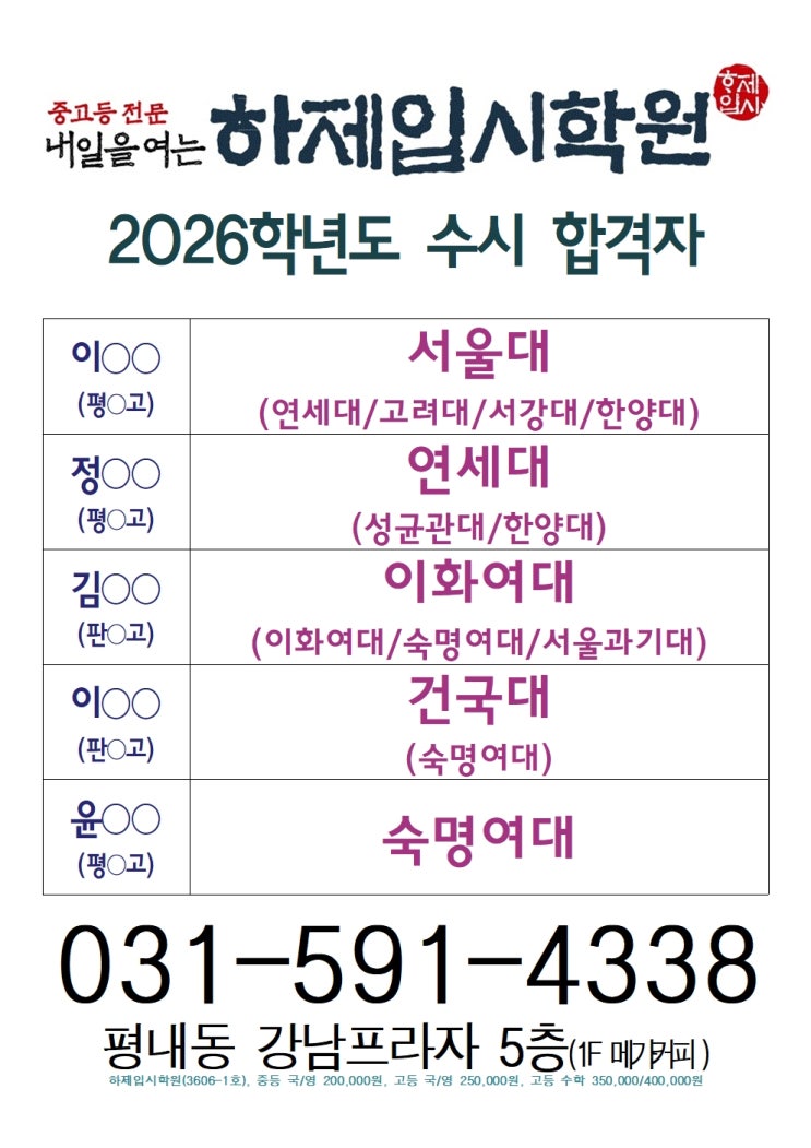 안녕하세요. 남양주 입시 명문 하제입시입니다. 25년 12월 23일자로 26학년도 수시 전형의 합격자(최종) 발표가 완료되었습니다. 합격한 모든 학생들에게 축하를 보냅니다. 수시 합격의 기쁨을 함께하지 못한 수험생들에게 위로를 보내며, 더 나은 미래의 결과가 있을 것이라고 믿습니다. 3년간 노력한 저희 학원 학생들의 26학년도 수시 전형 최종 결과입니다. <img src="https://blogthumb.pstatic.net/MjAyNTEyMjRfOTgg/MDAxNzY2NTY5MDMxMDUx.X1QhekayRQjPELLdGe4Sen3Hzu0ANJ-80b7Tu5_mudgg.eny21kYQVFbPb4RcO0jkqQECpg9ejlYXMRKEiJfSTGEg.JPEG/26%C7%D0%B3%E2%B5%B5%BC%F6%BD%C3%C7%D5%B0%DD%C0%DA%28%C3%D6%C1%BE%29001.jpg?type=s3" />