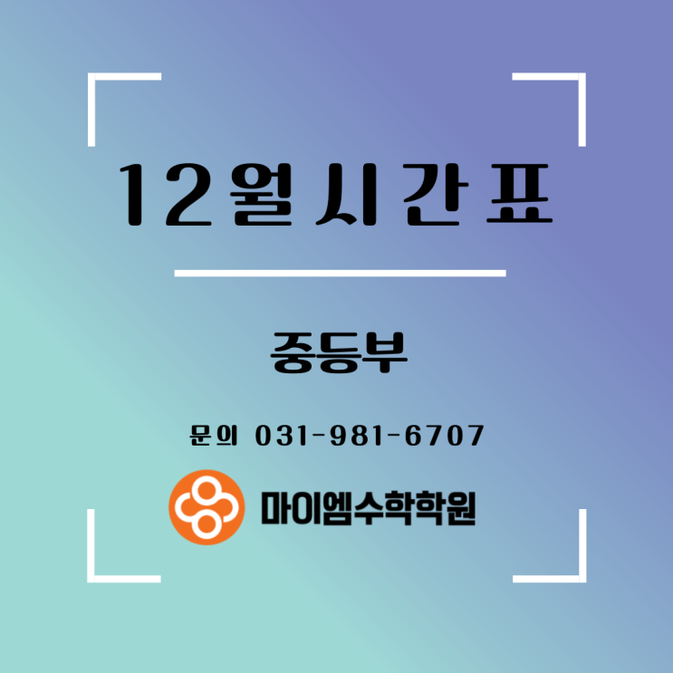 안녕하세요^^ 김포장기동수학학원 마이엠수학학원입니다. 12월 중등부 시간표 및 교재를 안내해드리겠습니다. 중등부 시간표 #김포장기동수학학원 #장기동수학학원 #운양동수학학원 #장기동초등수학 #장기동중등수학 #장기동고등수학 <img src="https://blogthumb.pstatic.net/MjAyNTEyMjFfMTUg/MDAxNzY2MzA4NzYzOTg5.eFmCOVDvQmHYd0CzybUMMtj3Uq21zIkfGbfoFBsml-sg.ZtWcBDh4I8nQVqEV9Q2-jTVLE6LUTbctr9xQHLwGO4gg.PNG/%C1%A6%B8%F1%C0%BB-%C0%D4%B7%C2%C7%D8%C1%D6%BC%BC%BF%E4_-001_%282%29.png?type=s3" />