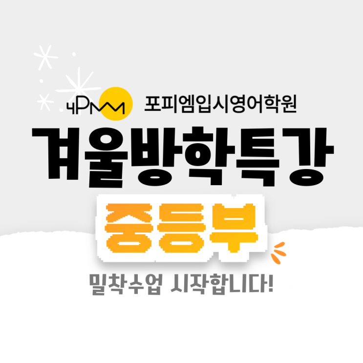 수업만 듣지 않습니다. 배운 건 그날 바로 첨삭까지! I 겨울 특강을 준비하게 된 이유 포피엠영어 중등 재원생들을 대상으로 2026년 1학기 반편성고사가 마무리되었습니다. 이번 평가를 통해 문법 개념의 재정리를 통한 문장 해석과 영작으로의 적용이 고등까지 연결되는 탄탄한 중등 영어를 준비를 위해 겨울방학 동안 꼭 보완되어야 할 핵심 과제로 드러났습니다. 그에 따라, 학생들이 실제로 어려움을 겪고 있는 두 가지 영역을 중심으로 밀착 집중 특강 두 과정을 개설하게 되었습니다. II 포피엠 특강은 특강이라고 해서 단순히 강의만 듣고 끝나는 건 아닙니다. 당일 수업 → 실습 → 개별 첨삭까지 바로 마무리되는 구조로, 수동적인 강의....... <img src="https://blogthumb.pstatic.net/MjAyNTEyMjlfMjg5/MDAxNzY2OTk0OTYyNzk3.0LsFOlTtmtGcHAiMc_ZCn4nAa5EHyaaXFAqTiSsJQTIg.HF9Sm4GFzkDrQ-oewTUkQR5fGrjf9i427TfsooLHyTIg.PNG/%B0%DC%BF%EF%B9%E6%C7%D0%C6%AF%B0%AD-%BD%E6%B3%D7%C0%CF-001.png?type=s3" />