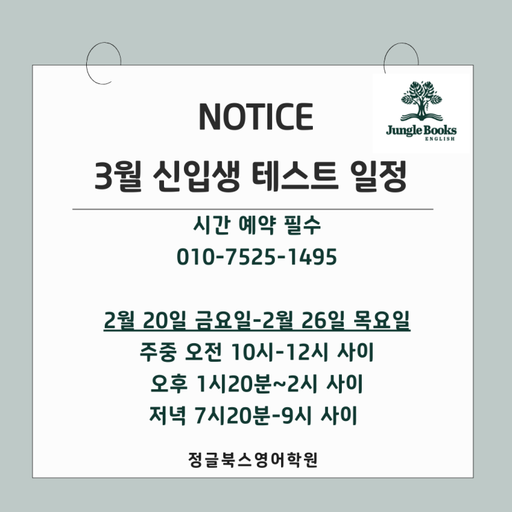 안녕하세요, 동탄2신도시 청계동 정글북스영어학원 엘리나 원장입니다. 3월 신학기 전 신입생 입학테스트 및 상담 일정을 안내드립니다. 010-7525-1495 문자 또는 카톡으로 (jungle1495)로 학생 이름, 3월 기준 학년, 영어책 읽기 레벨 정도와 위 일정 중 가능한 요일과 시간대를 알려주시면, 확인 후 연락드리도록 하겠습니다. 네이버톡톡은 확인이 바로 안되어, 학원 번호로 문자가 카톡만 받겠습니다. 감사합니다. https://blog.naver.com/junglebooksenglish/224176593165 #정글북스영어 #동탄2초중고영어 <img src="https://blogthumb.pstatic.net/MjAyNjAyMTFfMzYg/MDAxNzcwNzk5NzYxMTUw.BZ_Hb3UGEGZykVT87KUrkAGqBtsOrnIBOrM1WnYz-Wsg.RgPfN8zq7b4dcilUpXvuVphsZwNwDmkvYB8cwHIDn9sg.PNG/26.1.31_%C5%E4_10%BD%C3-1%BD%C3_%288%29.png?type=s3" />