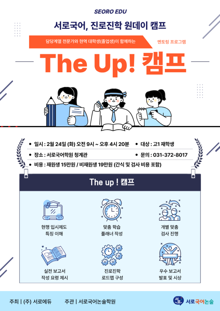 안녕하세요, 서로국어학원입니다. 고등학교 1학년으로 새롭게 출발하는 지금, 막연한 불안 대신 분명한 방향을 준비할 시간입니다. 서로국어학원에서는 현행 입시제도를 정확히 이해하고 학생 스스로 자신의 진로와 학습 전략을 설계할 수 있도록 돕는 ‘The Up! 진로·진학 원데이 캠프’를 진행합니다. 캠프 개요 일시 : 2026년 2월 24일(화) 오전 9시 ~ 오후 4시 20분 대상 : 고1 학생 장소 : 서로국어학원 청계관 비용 : 재원생 15만원 / 비재원생 19만원 문의 : 031-372-8017 신청 : https://naver.me/xM5MGJG1 ※ 신청자는 2/20(금) 까지는 검사 완료되어야 하며, 노트북 혹은 태블릿 필수 지참 입니다. The Up! 캠프의 핵심 프로그램 이번....... <img src="https://blogthumb.pstatic.net/MjAyNjAyMTJfMjk0/MDAxNzcwODg3MTcwMzc0.ffljATpY5WE6PTKQ1-c6vI77479xJtKLhJqdDkQVHTkg.KivDgpc9JL1fuRHYNH6gudY2wxRGGPJmLtHj6asUWg0g.PNG/1.png?type=s3" />