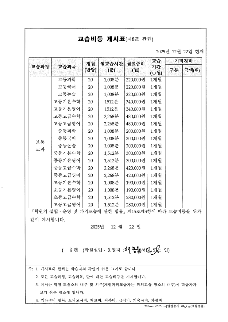상계동 유캔수학 전문학원 교습비(원비)