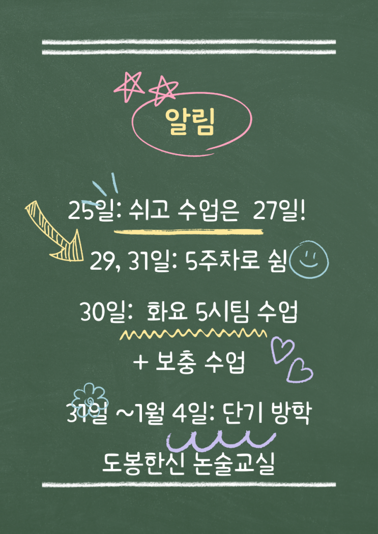 #연말연시 #교습소 #연말스케줄 #도봉구논술 #방학스케줄 #초등논술 연말연시를 앞두고 독서 교실 일정을 안내합니다. 방학 특강을 신청한 학생들은 기존 시간과 특강 시간으로 일주일에 두 번 나옵니다.♡ <img src="https://blogthumb.pstatic.net/MjAyNTEyMjNfMjkz/MDAxNzY2NDk3NzM0Nzkz.MKVouPTSfBTbWMMpU0V4sJ4O3cPwwpYUgmQUDCTRBMAg.GhdJW09LRKO4YT0-PX22eCyp7retVSvP53w9jO3WUeQg.PNG/900%A3%DF%BE%CB%B8%B2%A3%DF20251223%A3%DF224822%A3%DF0000.png?type=s3" />