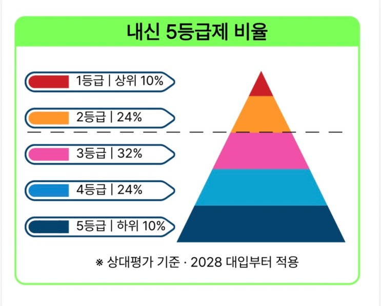 수능 5등급제에 따른 내신 및 대학 입시 전략을 정리했어요. 2028 대입 개편안에 따라 내신 제도가 크게 바뀌고, 이에 따른 준비 방향도 달라지고 있습니다. 1. 수능·내신 5등급제란? 내신 5등급제 도입 * 내신 등급이 9등급 → 5등급으로 바뀝니다. * 상위 10% → 1등급, 누적 34% → 2등급, 66% → 3등급, 90% → 4등급, 그 외 → 5등급 등입니다. * 상대평가(5등급)와 절대평가(A~E) 성적이 함께 기록됩니다. 통합형 수능 * 국어·수학의 선택 과목이 사라지고 공통형 수능으로 바뀝니다. * 사회/과학 영역도 통합 과목 형태로 개편 예정입니다. 2. 내신 5등급제 변화의 핵심 의미 ✨ 변별력 변화 * 1등급 범위가 넓어지면....... <img src="https://blogthumb.pstatic.net/MjAyNTEyMjZfMzcg/MDAxNzY2NzQzNDY3MzEz.A7bK7onvSW0tjX2Q-UjbkxX8EK9FflA5IbGzzeWABD8g.azScqZOwWC7-Zs5GcSLxQ4JEZJv7f8jBX3yuoPW8xpog.JPEG/IMG%A3%DF7714.jpg?type=s3" />
