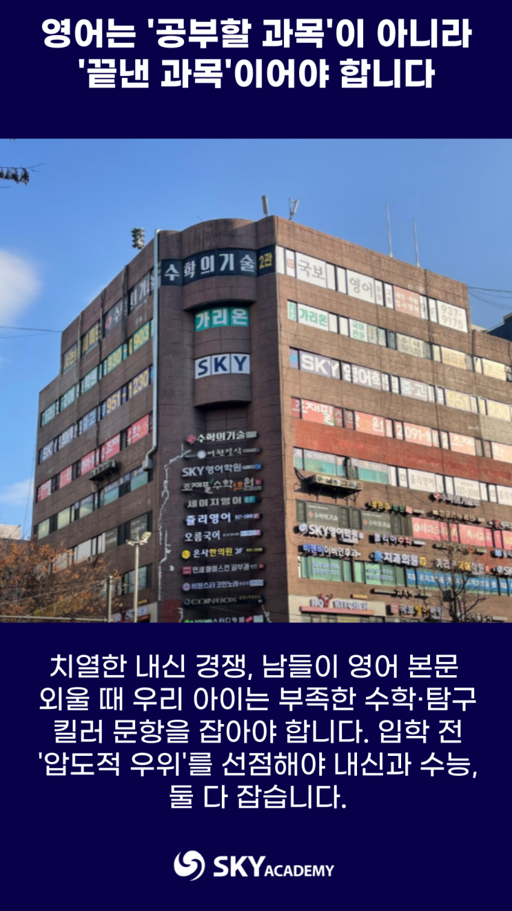 #중계동영어학원 #노원구영어학원 #특목고입학 #자사고입학 #과학고입학 #의대입시영어 #노원구상위권 #스카이영어학원 #은행사거리영어학원 #중계동특목고대비 #과학고진학 #상산고준비 #하나고준비 #선덕고준비 #수능최저충족 #고등영어선행 #중계동학원추천 "아이가 과학고 가서 수학, 과학 하기도 바빠 죽겠는데... 영어 등급이 안 나와서 발목을 잡네요." 중계동 영어학원 상담실에서 매년 3월이면 들려오는, 특목·자사고 신입생 학부모님들의 뒤늦은 후회입니다. 중학교 내신이 줄곧 A등급이었기에 "영어는 기본은 하겠지"라고 안심하고, 수학과 과학 선행에만 몰두했던 결과가 고등학교 첫 성적표에서 '충격....... <img src="https://blogthumb.pstatic.net/MjAyNjAyMTJfNjIg/MDAxNzcwODY0Mjc1ODAw.bJtUZs9YZp9YpoDRoOPj51hLEUVewqwnkQNXj6h7dDEg.iZVOBYx24qtEZldhPqheNVkETt5Wg6L4xtmHZfofkbUg.PNG/004.png?type=s3" />