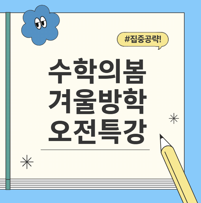 안녕하세요 오목교역 수학학원 수학의봄입니다. 이번겨울방학에는 오전 특강이 주로 개설됩니다. 개별수업이 주로 이루어지고 같은 학년, 과정인 학생들끼리 최대한 같은 반으로 안내드리고 있습니다 :) 오전시간 초등부 10시~12시 (2시간) 10시~12시30분 (2시간반) 오전시간 중등부 10시반~ 13시 (2시간반) 상담전화 : 01076437424 각 반마다 선착순으로 마감합니다. 초등부 정원 6명 중등부 정원 8명 입니다. 상담전화 : 01076437424 <img src="https://blogthumb.pstatic.net/MjAyNTEyMjNfMTkz/MDAxNzY2NDc3ODM0NDg4.yKNzmZVn7fCssZXsffPw4WHab5MRypmbagdSWV-HTaAg.mk9PImaHREe_-T5YpXx_OukiKsjw0HWkKPDEk24d8dsg.PNG/image.png?type=s3" />