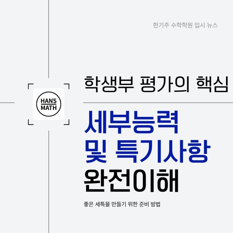 안녕하세요~ 언제나 정성을 다하는 30년 수학교육 전문 한기주 수학학원입니다! 세부능력및특기사항, 줄여서 ‘세특’의 중요성이 점점 높아지고 있습니다. 대입 수시에서 큰 비중을 차지하는 학생부종합전형은 교과 성적만을 반영하는 학생부교과전형과 달리, 학생부를 종합적으로 평가하는 전형입니다. 학생부에는 교과 성적뿐만 아니라 학생의 학교생활 전반이 기록되며, 그 대부분이 평가 요소로 활용됩니다. 그중에서도 오늘은 ‘세부능력및특기사항’이 무엇인지, 왜 중요한지, 그리고 어떻게 준비해야 하는지를 중심으로 살펴보겠습니다. 1.'세부능력및특기사항' 무엇인가? 대입 수시에서 상위권 대학일수록 학생부종합전형의 비....... <img src="https://blogthumb.pstatic.net/MjAyNTEyMjZfMTk5/MDAxNzY2NzMwOTg4NjQ0.7Z5P8jE6lmzNORDnL4OjtqK_ZXITYKmFvkqSLbdqdWgg.ruaf9trhl4kxgxjzciot6a7Vt1g2caztTMUfgjEjvT0g.JPEG/1.jpg?type=s3" />