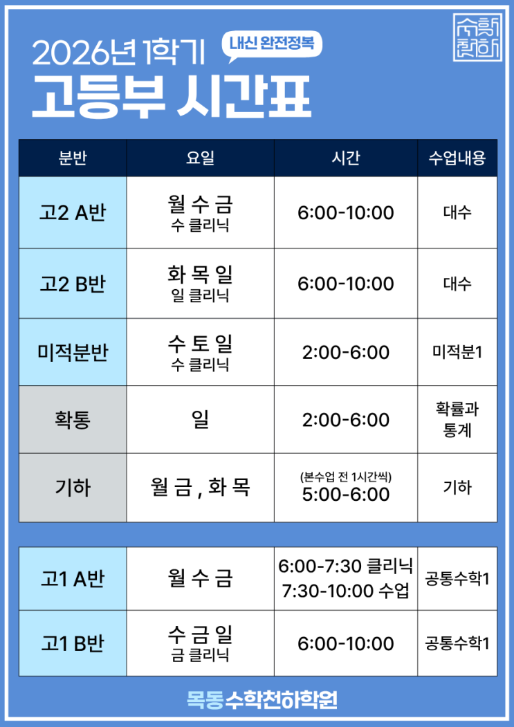 수학천하 2026년 1학기 고등부 시간표 안내