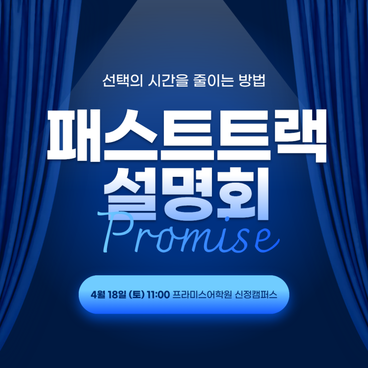<목동 영어학원 선택의 시간을 줄이는 방법> 안녕하세요, 신정 프라미스 어학원입니다. 아이 학원을 알아보는 과정, 생각보다 쉽지 않습니다. 설명회 한 번으로 끝나는 게 아니라 테스트 일정과 상담 일정도 다시 잡아야 하고.. 아이 교육이라 더 신중해질 수밖에 없고 그래서 더 많은 시간과 에너지가 들어가죠. "이 과정을 조금 더 효율적으로 만들 수는 없을까?" 그래서 프라미스어학원에서는 5월 개강맞이 4월 18일 토요일, 패스트트랙 설명회를 진행합니다. 프라미스어학원의 패스트트랙은 단순한 설명회가 아닙니다. ✔ 커리큘럼 설명 ✔ 입학 레벨테스트 ✔ 결과 기반 상담 ✔ 반 배정 안내까지 이 모든 과정을 한 번에 진....... <img src="https://blogthumb.pstatic.net/MjAyNjAzMzFfMjc3/MDAxNzc0OTQ5MTg1NDM4.lcdxp9NH9JHFLENj4glT2KCD3zRpmMhToYqegceN3GEg.mY4ktHw37X9Id0P0VlOUVs3ICpvDOjciuMgdYiWdpY8g.PNG/0401_%BA%ED%B7%CE%B1%D7%BD%E6%B3%D7%C0%CF.png?type=s3" />