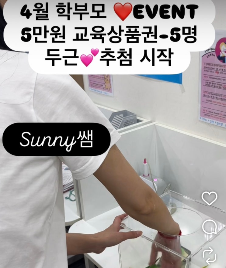이벤트에 응모해 주신 학부모님~감사합니다^^ 당첨된 학생은 다음 달 교육비에서 교육상품권 자동으로 사용되어 교육비 5만원 off됩니다 소개 EVENT -교육 상품권 각각 3만원 (4월 이벤트) 진행 중입니다. 명단: 전재희/ 김효은/이지아/이건희/이지원 <img src="https://blogthumb.pstatic.net/MjAyNjA0MDVfMjkw/MDAxNzc1MzgyNTYyMDM3.eRGL0Yj69ORqdqaElbJPs9t15oo7SUWS2tisztDAbNsg.gc0PNSholboKxSYZ98V2HOEueaMikBSg9fau2sa17ogg.JPEG/IMG%A3%DF0246.jpg?type=s3" />