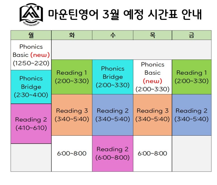 안녕하세요. 마운틴영어입니다. 지난 한 해 동안 학원과 함께해 주신 모든 학생과 학부모님께 진심으로 감사드리고, 각자의 자리에서 최선을 다해 한 해를 마무리한 만큼, 이제 2026년 새학기 준비를 합니다. 한 명 한 명 아이들에 맞추어 세심하게 관리하고, 아이들은 즐겁게 배우고, 자신감을 쌓아 그 자신감이 더 큰 도전으로 이어지는 한 해가 되길 바래요. 새학기에도 많은 관심과 응원 부탁드려요. 2026년 3월 예정 시간표 안내드립니다. * 수업중에 전화상담이 안되오니, 문자로 남겨주시면 연락드리겠습니다. 상담 및 방문 예약은 꼭 미리! 문자로 연락주세요. (오전 10시~12 시 전화 상담 가능합니다.) ☎: 010-2894-2169 <img src="https://blogthumb.pstatic.net/MjAyNjAyMDZfMTMx/MDAxNzcwMzUxMjYzMjYy.ZPU-DuweafZEcaaGE97RaFtcebvHcQuQo0XDack72fsg.3Suzl02PB583GFAKVB-3K6UVex4rN7eHlyaE-7VuAi8g.JPEG/%C8%AD%B8%E9_%C4%B8%C3%B3_2026-02-06_131410.jpg?type=s3" />