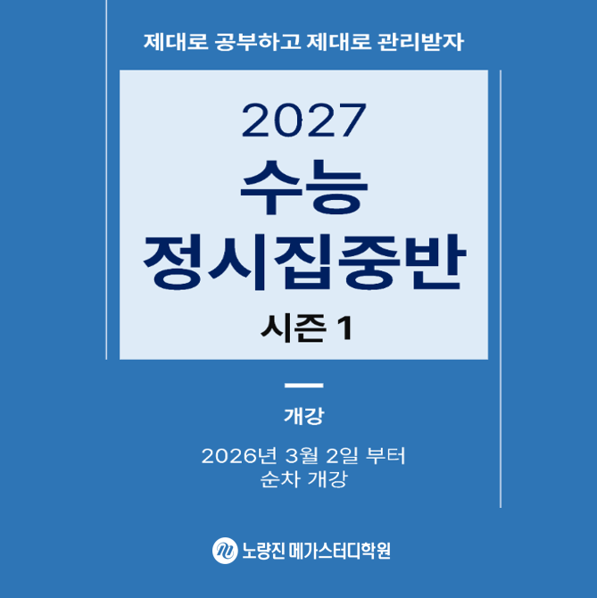 빈틈없는 관리, 틀림없는 결과! 안녕하세요. 노량진 메가스터디학원입니다. 노량진 메가스터디학원 2027 수능 정시집중반 안내 드립니다. 혼자 공부하면서 막막함을 느끼고 있나요? 이제 그만! 검증된 강의력과 풍부한 수능 경험을 갖춘 수능 전문 강사진과, 학생 개개인을 밀착 관리하는 입시 전문 담임선생님과 함께라면 공부도, 관리도 완벽하게 잡을 수 있습니다. 고3 수능 정시, 혼자가 아닌 전문가 집단과 함께 전략적으로 준비하세요. 제대로 공부하고, 제대로 관리받는 학생만이 목표 등급과 합격을 현실로 만들 수 있습니다! 대입 성공을 위한 강의 전문가 X 입시전문 담임 Collaboration 2027 수능까지 꽉찬 연간 학습관리 시스템 3월....... <img src="https://blogthumb.pstatic.net/MjAyNjAyMTJfMTAg/MDAxNzcwODY1Nzc1OTYw.J2AR_sl6Tv0wZtUeDMZ4D-qEje9bjoyrL2drmxJLfxUg.iVDbfFrW0JjDuRVkBSaP7UEIwSC-Vj9qfjyjmslKzPUg.PNG/image.png?type=s3" />