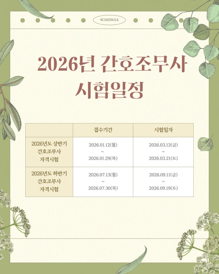안녕하세요 강남메트로간호학원입니다. 2026년 간호조무사 국가고시 일정 안내드립니다. 2026년 상반기 시험 접수기간은 2026.01.12(월) 부터 2026.01.29(목)까지입니다. 그런데 장소별로 응시원서 접수 시작일이 다르니 잘 보셔야합니다. 보통 성남이나 구로는 접수 시작일에 홈페이지 로그인이 잘 안되는경우가 많고 접수 시작과 동시에 마감되버리는 경우가 많습니다. 그래서 장소별로 시험 접수 시작일과 시작시간을 잘 인지하고 계셔야합니다. 특히 ★구로★는 서울 전역과 경기도에서 집중 신청하는 지역으로 1월 14일 2시에 국시원 홈페이지 로그인자체가 안되는경우가 많습니다. 저희가 경험해본 노하우 상 1월 13일 14시에 안전하게 성....... <img src="https://blogthumb.pstatic.net/MjAyNTEyMTlfOTgg/MDAxNzY2MTMxMjQxNzQy.hlw9JuHK5zETssSnt5ev5dFCnV_LFlEn1zVDeFQArRUg._JkErRONdZuFiy5FXh0ZIlMyiGxvCobYnvaEQNrcvksg.JPEG/2026%B3%E2_%C0%CF%C1%A4_%C6%CB%BE%F7.jpg?type=s3" />
