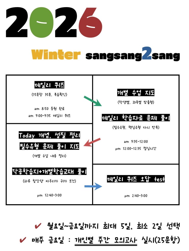 - 12월 30일 시작(화목반으로 운영) - 매주 화요일, 목요일 5시부터 시작 - 매회 모의고사 실시 - 연습문제 제공(양이 엄청납니다) - 현장 첨삭 상시 진행 - 주요 파트별 이론 강의 ★ 잔디학원 홈페이지 안내 의대, 명문대 진학을 위한 영재학교, 과학고 준비 진학 결정하기 전 확인해야 할 사항, 준비 방법, 학교별 정보까지, 관련 정보 총정리 잔디학원에서 도와드리겠습니다! 학원 연락처 조한수 원장 H.P. (010-9889-4080) 잔디학원 (02-6951-4080) 고등학교 물리학1/2 내신 개인 지도 ⇒ 개인 지도 진행 고등 학교 물리 내신, 잔디학원에서 해결해 드리겠습니다. (조한수 원장과 직접 상담 후 시간 결정) 전수업 공통 Clinic 진행 ⇒ 잔디....... <img src="https://blogthumb.pstatic.net/MjAyNTEyMThfNjMg/MDAxNzY2MDUxNDc2NDg4.SRtAELUaxdsx6rCh9-wYXPrRt_3ynX6lgDuFm8hxlo0g.vJJH3xuAXlsCRgYj4NbYiI7Gi3iJTpavEkjkn3MjDMkg.PNG/image.png?type=s3" />