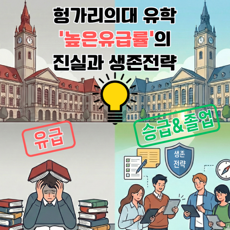 안녕하세요! 헝가리 의대 유학을 준비하시는 분들이 가장 걱정하시고, 또 반드시 짚고 넘어가야 할 주제인 '유급률'에 대해 오늘 솔직하게 이야기해 보려 합니다. "헝가리 의대는 들어가기는 쉬워도 나오기는 어렵다"는 말, 한 번쯤 들어보셨을 겁니다. 과연 이 말이 사실일까요? 그리고 왜 이런 말이 나왔을까요? 오늘 그 이유와 대처법을 낱낱이 파헤쳐 드립니다. 1. 헝가리 의대, 유급률의 현실 (팩트 체크) 결론부터 말씀드리면, "입학은 국내 의대에 비해 비교적 수월하지만, 학년 승급은 매우 까다롭다"는 명제는 사실입니다. 스트레이트 졸업 비율: 통계적으로 입학생 대비 유급 없이 6년 만에 졸업하는 비....... <img src="https://blogthumb.pstatic.net/MjAyNTEyMjhfNjcg/MDAxNzY2OTA5MjM2NjU4.7TgeXlrJ-ySENsgTqH2UiaHCC0RAIF9hr2MmRJD3TBQg.rfRwD6dZqNVn_hTIwh6B5IRlK0oOkm1fKXHyaJZXrGYg.PNG/%C7%EB%B0%A1%B8%AE%C0%C7%B4%EB_%C0%AF%C7%D0_%B3%F4%C0%BA%C0%AF%B1%DE%B7%FC.png?type=s3" />