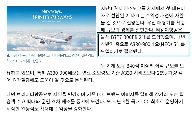 유현정강사 입니다. 티웨이항공이 내년 상반기안에 트리니티 항공사로 사명을 바꾸고 운영한다고 하죠? 차근차근 준비 중입니다. 그런데 2024년 무려 중대형기 그것도 에어버스의 최첨단 중대형 A330-900NEO를 국내 최초로 도입한다고 발표했는데 이를 그대로 경영진이 바뀌었지만 그대로 물려받습니다. 다행이죠? 일단 무려 10대 리스계약을 했습니다. 이것이 내년부터 들어 옵니다. 내년 하반기중 5대가 한꺼번에 들어온다는 거죠. 그리고 2027년에 또 5대가 들어 옵니다. 대형기에요. 비즈니스석이 있는 비행기 입니다. 승준생은 비행기가 들어오는 소식에 귀 귀울여야 합니다. 채용과 바로 연결되는 소식이니까요. 이제 티웨이항공은 LCC 항....... <img src="https://blogthumb.pstatic.net/MjAyNTEyMjlfNiAg/MDAxNzY2OTY2OTE4OTQ1.ry03dNTteRVXRW3PKxiY5wd4cfXYSWAD1602nn6-OzYg.CIJyeG7ib6HUZLyqT0hEvGq2G2iGywM3OhngW5IpJkYg.PNG/2025-12-29_09%3B04%3B28.PNG?type=s3" />