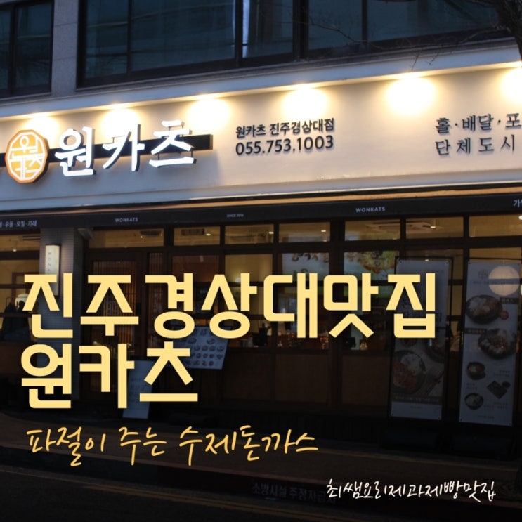 토요일 산청 수업이 끝나고 큰아들이 경상대근처 PC방에서 친구들과 놀고있다는 얘기를 듣고 그럼 끝나고 근처에서 밥먹자고 했지요. 경상대 정문 근처에서 뭐 먹을까 고민하다가 다녀온 수제돈까스전문점 원카츠 후기를 남겨보려고 해요. 이미 가좌동 맛집으로 입소문 난 곳이라 궁금했는데, 다녀와보니 왜 인기 있는지 알겠더라고요. 먹는 내내 기분 좋았던 곳이었어요. 원카츠 는 진주 경상대학교 정문에서 도보로 이동 가능 한 위치에 있었어요. 찾아가기 어렵지 않았고, 경상대 학생들이 왜 많이 찾는지 바로 이해됐어요. 약속 장소로도 부담 없는 위치였어요. 별 그려진 지점에 원카츠가 있어요. 영업시간은 매장 앞과 네이버 플레이스에서....... <img src="https://blogthumb.pstatic.net/MjAyNjAyMjJfMjM2/MDAxNzcxNjg4MTU1Mzc0.OYqZwgFCo5gnvDD7XXDUde4WxoZ2ikajuj4vuSZkp_kg.CW6OnRSkGJ9UyiHexX9-cVlgnKljnMRwK4rifFm2qzwg.JPEG/900%A3%DF20260222003534.jpg?type=s3" />