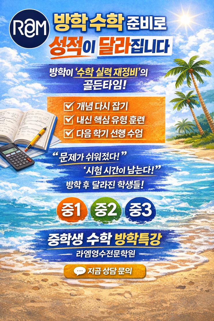 방학 수학 준비로 성적이 달라집니다 중학생 자녀를 둔 학부모님들이 방학을 앞두고 가장 많이 검색하는 키워드가 바로 “중학생 수학 방학특강”, **“중학생 수학 학원 추천”**입니다. 그만큼 방학 동안 수학을 어떻게 준비하느냐가 성적을 좌우하기 때문입니다. 라엠영수전문학원은 매년 방학 이후 성적 변화로 그 결과를 증명해왔습니다. ⸻ 중학생 수학, 왜 방학 준비가 중요할까요? 중학생 수학은 ✔ 개념 난이도 급상승 ✔ 단원 간 연결 구조 ✔ 한 번 놓치면 따라가기 어려운 과목 이라는 특징이 있습니다. 특히 • 중1 → 중2 • 중2 → 중3 이 시기에 개념 공백이 생기면 내신 성적이 급격히 흔들립니다. 그래서 라엠영수전문학....... <img src="https://blogthumb.pstatic.net/MjAyNjAxMTRfMjM1/MDAxNzY4MzY5OTg0Mjc4.g2JPB-ekD9eltwheHcumvJ5okYBEdHb4y8NttpU1YeAg.-Kk1qigu-8n5qicyBjpFWl5i_yKIR5Vag0fczCIXVeAg.PNG/%C8%AB%BA%B8%BB%E7%C1%F8.png?type=s3" />