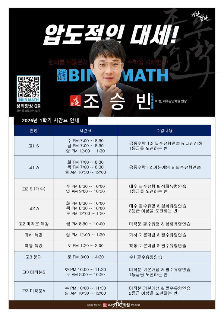 2026년 1학기 시간표 입니다. "지금의 하루가, 내신과 입시를 바꿉니다." 시간표가 변동될 수 있습니다. 등록을 희망하시는 학부모, 학생분들께서는 등록 전 학원으로 문의바랍니다. ▶ 강단학원 중등 GT 관(2층) - 초중등수학 T. 900-5297 ▶ 강단학원 F층 - 중고등영어, 중고등국어 T. 702-5297 ▶ 강단학원 5층 - 고등수학 T.702-6297 #제주강단학원 #강단학원 #제주국어 #제주국어학원 #제주시국어학원 #제주국어전문학원 #제주중등국어 #제주고등국어 #중등국어 #고등국어 #수능국어 #제주영어 #제주영어학원 #제주시영어학원 #제주영어전문학원 #제주중등영어 #제주고등영어 #중등영어 #고등영어 #수능영어 #제주수학 #제주수학....... <img src="https://blogthumb.pstatic.net/MjAyNjAyMjFfNzQg/MDAxNzcxNjYwMDQyOTU3.o3aT-NZUxRkPOJ7iOQ8tcxVyIHG__ZqiH_GnbwzHGgMg.sT_U662HtU4Ba-xgXkexAjgKS80ny2sv3fSOqBVmU98g.PNG/2026_1%C7%D0%B1%E2_%BD%C3%B0%A3%C7%A5_%C1%B6t_%BC%F6%C1%A4.png?type=s3" />