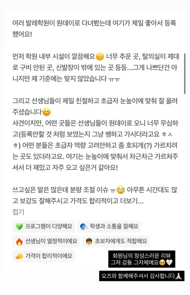 안녕하세요 오즈발레학원입니다 리뷰 숫자 100보다 그 안에 담긴 진심 하나가 저희에겐 더 큰 선물입니다 오즈를 믿고 함께 해주셔서, 그리고 이렇게 따뜻한 마음을 글로 남겨주셔서 진심으로 감사합니다! 오늘도 최선을 다하는 오즈가 되겠습니다 ☆상담예약필수☆ 대구 수성구 상록로 37, 3층 ☎문의전화 053-622-3382 네이버블로그 바로가기 https://blog.naver.com/ozkids486 카카오ID ozballet 인스타 @oz_ballet <img src="https://blogthumb.pstatic.net/MjAyNjAxMTNfMjYg/MDAxNzY4MjcxNDQzMjA0.RpNVA6ZjWRNkdWsK5DWMYU_FZu4BVGVaA_hJvd-P3Ocg.IgvSVXAgOEKQipRjZnaExw76ePppFR34Y0eEuYwK57wg.JPEG/KakaoTalk_20260113_101623175.jpg?type=s3" />