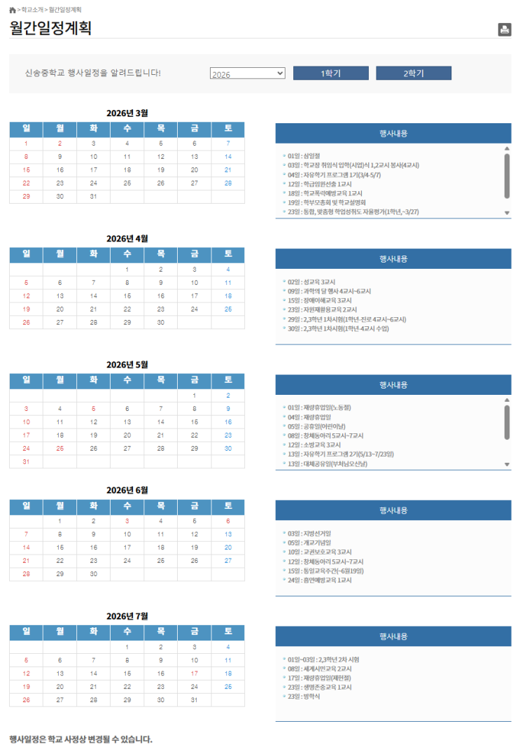 월간일정계획 < 학교소개 학교 시험 일정 ★ 학사일정은 학교 사정에 따라 추후 변동될 수 있으니 학교 홈페이지에서 꼭 확인하셔야 합니다! <img src="https://blogthumb.pstatic.net/MjAyNjAzMDRfMTMx/MDAxNzcyNjExMzQwMTc5.MZbGzeFGL_TbJqmFPh5wIITz0zrbsHGWZdZPBd36tycg.rhBIECrUVGG6clrEfue4qzkhaLH2zYJHTTJkDjNHuSIg.PNG/screencapture-shinsong-icems-kr-schdList-do-2026-03-04-17_01_32.png?type=s3" />