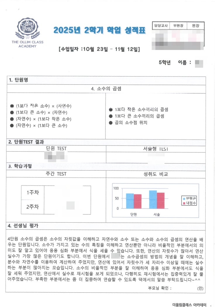 [서창동수학학원] 2025년 2학기 4단원 초등 5학년 학업성적표