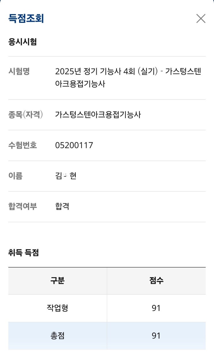 김 * 현님은 자기개발에 리얼 진심인 멋진 청년으로 기능사2회 피복아크용접기능사, 기능사3회 이산화탄소가스아크용접기능사, 기사3회 용접산업기사, 기능사4회 가스텅스텐아크용접기능사 까지 취득하였습니다. 첫 도전의 성공을 발판으로 한 단계 더 성장한 그의 이야기, 지금 바로 소개합니다. 아래의 내용은 2025년 기능사4회에 최종 합격한 김 * 현님의 가스텅스텐아크용접기능사 합격후기 입니다. 안녕하세요. 25년도 기능사 4회차 가스텅스텐아크용접기능사에 최종합격한 김 * 현입니다. 티그 용접기능사는 인천플랜트배관용접 학원에서 가장 먼저 준비했던 자격증이라 의미가 매우 깊습니다. 가장 중요한 8자위빙, 표면비드쌓기, 백비드....... <img src="https://blogthumb.pstatic.net/MjAyNTEyMjRfOTAg/MDAxNzY2NTMyMTIwNjU0.eNKPYnb8aLeFdOL8MRs6PQ4q1hQQEZeR_dI8IOGYE-8g.9e9kH8UIuKW7yZ4MmxWcZ2WfQHBGnZRINEqHO1ssoYQg.JPEG/%B1%E8_%C7%D0%C7%F6-%B0%A1%BD%BA%C5%D6%BD%BA%C5%D9%BE%C6%C5%A9%BF%EB%C1%A2%B1%E2%B4%C9%BB%E7.jpg?type=s3" />