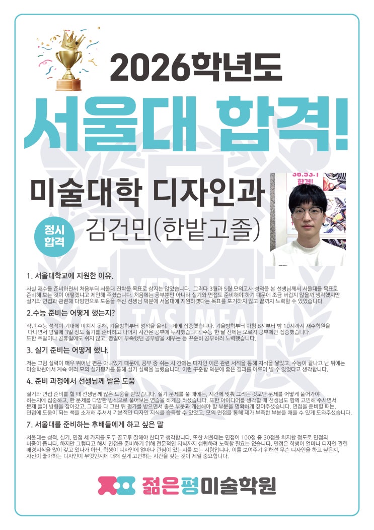 2026학년도 입시에서 미술대학 최상위권에 합격한 학생들을 소개합니다! 합격생들은 대전 젊은평미술학원에서 입시 전날까지 수업하고 합격한 학생들입니다. <img src="https://blogthumb.pstatic.net/MjAyNjAyMDJfMTY2/MDAxNzY5OTgzNjcyODMx.j2UEy9h0cT3pk8a6eF_gDU0MlsWUYj0FUqfcWIa_mMUg.c5ki8_f0C_wYY0tJPKLC-E57k_Ieen_ZMzuic5vnthog.JPEG/%BC%AD%BF%EF%B4%EB.jpg?type=s3" />