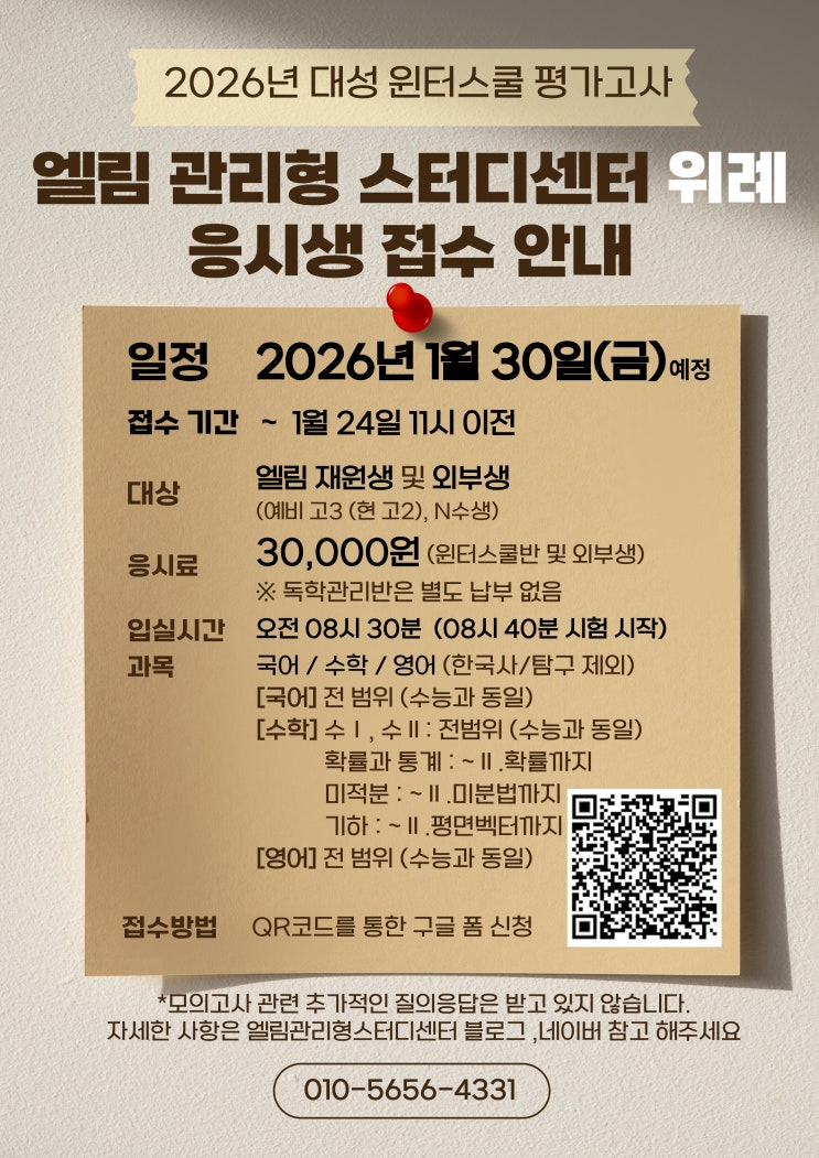 안녕하세요. 원탑영어학원입니다. 위례엘림입시센터에서 1/30 (금) 대성 사설모의고사 (고3, N수생 대상) 을 진행합니다. (국어/수학/영어 진행 - 한국사/탐구는 제외) 국어영역 : 전범위 (수능과동일) 수학영역 : 수1, 수2 전범위 (수능과동일) 확률과통계 / 미적분 / 기하 (수능과동일) 영어영역 : 전범위 (수능과동일) -겨울방학기간동안, 과목별 공부가 계획대로 잘 되고 있는지에 대한 중감점검 -영역별 부족한 유형은 무엇인지 정확히 파악하여 남은기간 보완할 수 있는 기회 가 될 것입니다. (영역별 상세 분석 성적표 제공 및 영역별 공부방향성관련상담 신청시 가능) 신청은 1/24(토) 오전 11시 이전까지만 가능하며, 하단사진의 구글폼....... <img src="https://blogthumb.pstatic.net/MjAyNjAxMjFfMjUz/MDAxNzY4OTc5ODAxOTg4.oKIJqo4GXp9ihOdj93QHeq6zpJp8QT1z1G4cpQ9tvKkg.BPIvixa5Isa-KOl9RrqjZBfzKmkxNg5EptUg-r5ltY8g.JPEG/KakaoTalk_20260120_222410515.jpg?type=s3" />