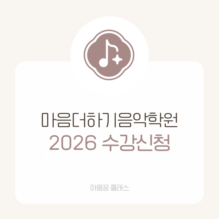 어느덧 새 학기를 준비하는 시기가 다가왔어요! 마음더하기음악학원에서는 아이 한 명, 한 명의 수업권 보장을 위해 매년 수강 신청을 통해 수업을 재정비하고 있습니다. 처음 보시는 분들은 "피아노 학원에서 수강 신청을 하나요?" 하고 궁금하실 수 있지만, 이 과정이 아이들의 수업 안정감을 지켜주는 중요한 기준이 됩니다 아래에서 2026년도 수강 신청 일정을 안내드릴게요! 수강 신청 대상 마음꿈CLASS 재원생 사전 열람 기간 안내 ✔️ 기간 2/2(월) 10:00 ~ 2/4(수) 20:00 ✔️ 안내 사항 1. 사전 열람 기간에는 수강신청서 구성과 내용을 미리 확인만 하실 수 있으며, 실제 접수는 진행되지 않습니다. 2. 이 기간에 제출....... <img src="https://blogthumb.pstatic.net/MjAyNjAyMDFfMTI0/MDAxNzY5OTU1Nzg4MTMw.7e9Y4HYHt7msie1Jrr2ukfOGa-w3NN4pen0NjjiQrnwg.kGTs6BnP8W41p6b8xDJd3J3GR-f3kwdGqqija_acNa0g.PNG/%BA%ED%B7%CE%B1%D7-%B0%F8%C1%F6_%BC%F6%BE%F7%B9%D7%BF%EE%BF%B5_%C5%AC%B7%A1%BD%BA%BE%C8%B3%BB_-005.png?type=s3" />