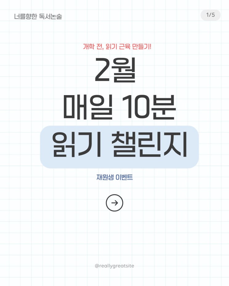 개학 전, 읽기 근육 만들고 가야죠?? ^^ 2월 재원생 이벤트를 준비했습니다. 매일 10분 읽기 챌린지 개학 전, 하루 10분으로 읽기 근육을 만들어요! ✅ 참여 방법 ✔ 매일 10분 읽기 ✔ 부모님 사인 ✔ 타임스탬프 앱으로 사진 촬영 → 미션 완료! 챌린지 혜택 읽기 근육도 키우고 선물도 받고! ⭐ 특별 이벤트 가장 멋진 인증 사진을 뽑아 추가 선물도 드려요! 2월 한 달, 매일의 작은 읽기가 큰 실력이 됩니다 <img src="https://blogthumb.pstatic.net/MjAyNjAyMDFfMzUg/MDAxNzY5OTQ1MTkwMTI0.CUqtOSMo4_2CO2WNJJpZaeUbwxEZQYpi5NWazZuR_NYg.HjlGq0_9F_vJPB4Ti_OkPrR0UlX7QFTAvn5x2nHCI0og.JPEG/1.jpg?type=s3" />
