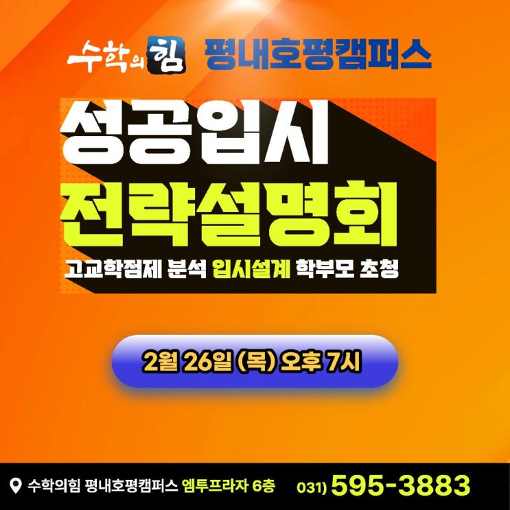 수학의힘 평내호평캠퍼스에서는 신경호 입시 전문 소장님을 모시고 학부모님들을 위한 고교학점제 분석 및 성공 입시 전략 설명회를 개최합니다. 가장 친절한 수학학원 평내동·호평동 수학학원 급변하는 입시 환경 속에서 고교 선택은 곧 대입 전략의 출발점이 됩니다. 이번 설명회는 단편적인 정보 전달을 넘어, 우리 아이에게 맞는 고교 선택과 장기적인 입시 설계 방향을 깊이 있게 안내드리고자 마련되었습니다. ‘고교학점제 분석을 통한 입시설계’, ‘학부모님 초청 성공 입시 전략 설명회’를 주제로 우리 지역 학교 분석부터 고교학점제, 그리고 2028 대입 개편안까지 입시에 꼭 필요한 핵심 내용을 체계적으로 다룰 예정입니다. [강사....... <img src="https://blogthumb.pstatic.net/MjAyNjAxMjlfODEg/MDAxNzY5Njc4NDMxOTQz.TGuPDtXlKjfbeqHiAbpMBoxfT0cWu7DTmRJV9Lifq-0g.N-f9BFP1Wv2GlrbYR-ljJsbfqLBfwFWahOQcPZaoTt8g.JPEG/%C1%A6%B8%F1%C0%BB_%C0%D4%B7%C2%C7%D8%C1%D6%BC%BC%BF%E4.-_%BA%B9%BB%E7%BA%BB.jpg?type=s3" />