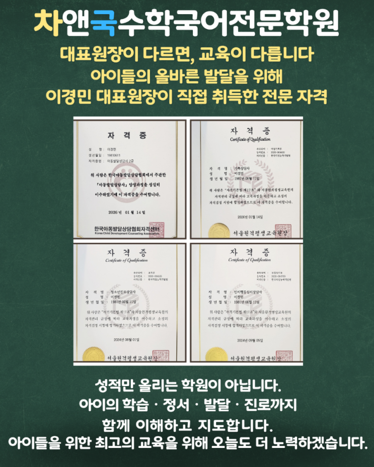 차앤국수학국어전문학원 대표원장이 다르면, 교육이 달라집니다.