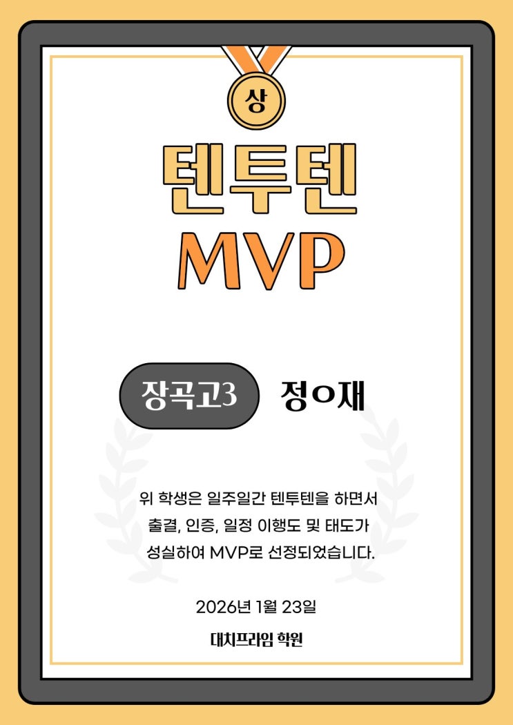 대치프라임학원 (능곡관) / 대치프라임장곡학원 (장곡관) 대치프라임 ‘텐투텐’ 주간 MVP 선정 안내 안녕하세요, 대치프라임 학원입니다. 겨울방학 동안 매일 오전 10시부터 밤 10시까지, 자신과의 싸움에서 이겨내고 있는 우리 학생들의 노력이 대견합니다. 텐투텐 프로그램의 핵심은 단순히 자리를 지키는 것이 아니라, ‘나와의 약속을 지키는 습관’을 만드는 것입니다. 대치프라임은 학생들의 체계적인 학습 관리를 돕는 동시에, 매주 성실함의 본보기가 된 학생들을 주간 MVP로 선정하여 격려하고자 합니다. ✨ 텐투텐 MVP 선정 기준 꾸준한 출결: 단 하루도 빠짐없이 매일 정해진 시간에 등원하는 성실함 플랜 완수: 아침에 스스로 세운....... <img src="https://blogthumb.pstatic.net/MjAyNjAxMjdfMjUy/MDAxNzY5NDgyODA1Mzgz.P8LXTPnSN019QvhL1S9pm2iXsF-FZLymis3tj50XQYsg.fHEtWifyQrK00myTNATYmzGXXPm72TBblVWmiECh0JAg.JPEG/KakaoTalk_20260126_163809667.jpg?type=s3" />