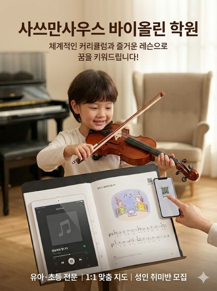 안녕하세요, **[사쓰만사우스바이올린학원]**입니다. 악기 교육, 가장 큰 적은 '지루함'입니다. 저희는 김연정 대표님의 교재 '꿈꾸는 바이올린교재' 도입하여, 아이들이 음악을 몸으로 느끼며 배우게 합니다. ✅ 1. 반주와 함께하니 '귀'가 트입니다. 단순히 활만 긋는 것이 아니라, MR 반주를 듣고 박자를 맞추며 연주합니다. 이 과정에서 리듬감, 박자감, 음정 정확도가 놀랍도록 향상됩니다. ✅ 2. 성취감이 다릅니다. 어려운 클래식 곡만 고집하지 않습니다. 아이들에게 익숙한 동요와 명곡을 연주하며 "나도 할 수 있다!"는 자신감을 심어줍니다. ✅ 3. 눈높이 맞춤 이론 어린 연령대의 아이들도....... <img src="https://blogthumb.pstatic.net/MjAyNjAxMzFfNjgg/MDAxNzY5ODM1MjEwMjIw.a6cOIjPVluWBQiBbcKUMQR8R08Ghi3OvuRkl4-NxUHcg.9A4YIVhR3ftReKEIKqmGJca8Jq4Boul-qyjj7o6jvdwg.JPEG/unnamed_%284%29.jpg?type=s3" />