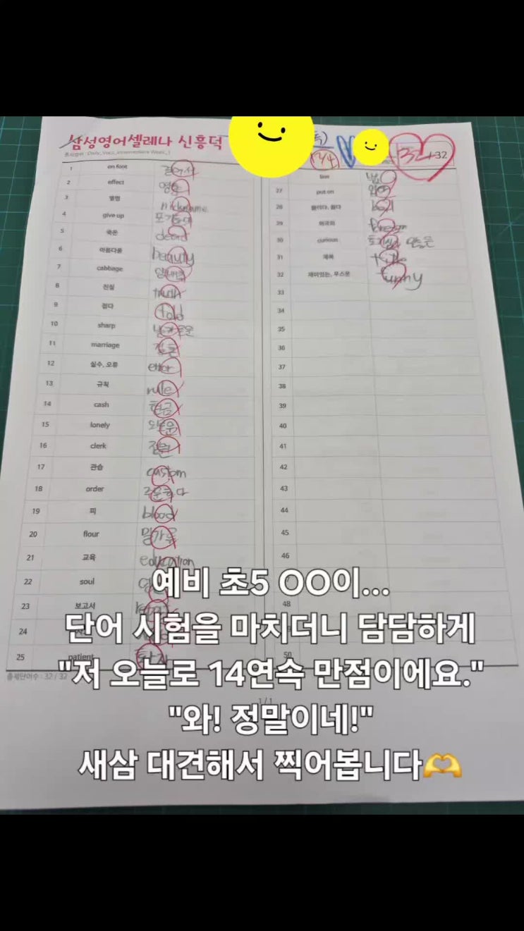 안녕하세요. 삼성영어셀레나 신흥덕 롯데캐슬 교실입니다. 신갈동에서 신갈초, 구갈중, 신릉중 학생들을 지도하고 있습니다. 모든 직업에는 각자의 보람이 있습니다. 선생에게 가장 큰 기쁨은 무엇일까요? 학생의 눈부신 노력, 그리고 여기에 자연스럽게 따라오는 '성장'을 마주할 때입니다. 최근에도 절로 미소를 띠게 된 일이 있었습니다. 오늘로 14연속 만점이에요. OO이가 단어 시험을 보고 나서 말했습니다. "저 오늘로 14연속 만점이에요." "진짜? 대박!" 그 자리에서 시험지를 팔랑팔랑 넘겼습니다. 정확히 열네 번째더라고요. 최근 만점 행진을 이어오고 있다는 건 알았는데, 막상 세어보니 더 대견했습니....... <img src="https://phinf.pstatic.net/image.nmv/blog_2026_01_22_1169/PaGV96cUj0_01.jpg?type=f480x480" />