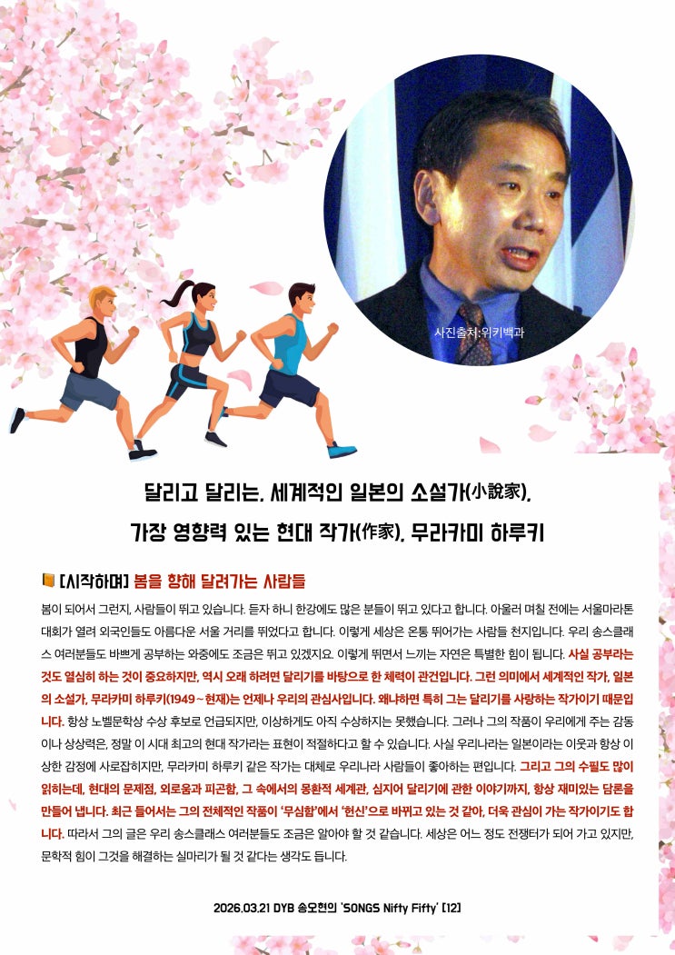 모바일로 보시는 분들은 하단으로 내려주시기 바랍니다. > 인쇄용은 상단 첨부파일을 다운로드하시기 바랍니다. > 댓글을 쓴 후, 하단 내 글 보관하기에 들어가서 보관해주세요. "SONGS Nifty Fifty for Song's Class" *학생용 글 입니다 -모바일- 2026.03.21 DYB 송오현의 ‘SONGS Nifty Fifty’ [12] 달리고 달리는, 세계적인 일본의 소설가(小說家), 가장 영향력 있는 현대 작가(作家), 무라카미 하루키 [시작하며] 봄을 향해 달려가는 사람들 봄이 되어서 그런지, 사람들이 뛰고 있습니다. 듣자 하니 한강에도 많은 분들이 뛰고 있다고 합니다. 아울러 며칠 전에는 서울마라톤대회가 열려 외국인들도 아름다운 서....... <img src="https://blogthumb.pstatic.net/MjAyNjAzMTlfMTEg/MDAxNzczOTA2Mjk4NDI0.OojBDlpx2ksL1uvM5brCUXiVE-GZsUv1FADy3BAhTTUg.14z9tCCSfLuFg8xl-lW6C1pAlBsYwjCgenyzUAC5Yy0g.JPEG/20260321_%B9%AB%B6%F3%C4%AB%B9%CC_%C7%CF%B7%E7%C5%B0_%BE%D0%C3%E0_1.jpg?type=s3" />