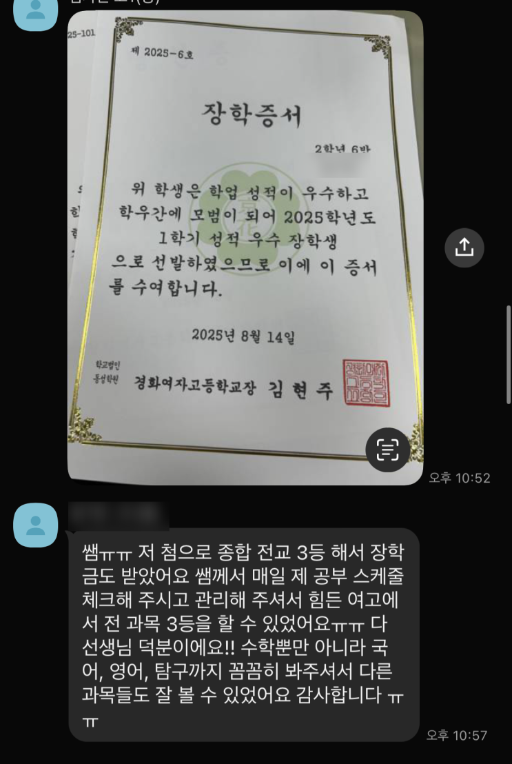 공부는 점수를 올리는 일이 아니라 ‘끝까지 포기하지 않는 자신’을 만들어가는 과정입니다. 이번 시험을 마치고, 세 명의 고2 아이들이 보낸 메시지를 읽으며 그동안 함께 쌓아온 시간이 얼마나 값졌는지 마음 깊이 느꼈습니다. “포기하지 않았기에, 결국 전교 3등으로!” 이 친구는 늘 꼼꼼했어요. 어려운 문제 앞에서도 포기하지 않고 끝까지 풀어보려 했고, “오늘은 여기까지만이라도 해보자”는 마음으로 하루를 쌓아갔습니다. 그 결과, 이번 시험에서 수학 전교 5등, 그리고 종합 전교 3등이라는 놀라운 결과와 함께 장학금까지 받았습니다. “선생님이 매일 체크해주시고 포기하지 않게 도와주셔서 여기까지 올 수 있었어요. 정말 감사....... <img src="https://blogthumb.pstatic.net/MjAyNTExMDZfMjk1/MDAxNzYyNDM3OTIxNDUy.tuABr99cw0uNqhwkBcPBL_h8dQhMOy4eDsgtpYJDjUkg.bxC_sd45TG5Fbl8spkBTQzkV4pxvHpfIhEAgvAWj4hQg.PNG/KakaoTalk_Photo_2025-11-06-22-38-07_002.png?type=s3" />