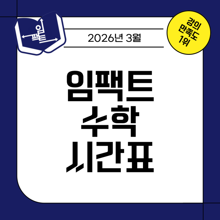 안녕하세요 임팩트 수학 원장 전성민입니다. 2026년 3월 학습 시간표 안내드립니다. 중등부는 각 반 과정별 진도를 진행합니다. 고등부는 전원 1학기 1차 내신대비를 진행합니다. (3월에 중간고사 범위 1회독) 선택과목(기하, 확통)에 시간표는 추후 다시 공지하겠습니다 임팩트 고등부 선생님들은 모든 과정이 가능한 선생님으로 이루어져 있으면 현재도 모든 학년의 수업이 진행 되고 있습니다. 모든 학생이 다 좋아지는 것은 아니지만 더 잘 할 수 있도록 임팩트가 같이 노력하겠습니다. 성적향상이 많은 임팩트 수학과 함께 하시기 바랍니다. 말만 하지 않고 행동으로 보여드리는 수학학원이 되겠습니다. 많은 관심 부탁드립니다. 상담문의) ....... <img src="https://blogthumb.pstatic.net/MjAyNjAyMTNfMTkg/MDAxNzcwOTYyMjYwOTA5.7DJxuNzn6ME7Fxy8crwVsiZOt8qSCngOHhEJNIKx6cQg.0IBCoSnCIWg_9MVJCAyHvi7pCgjzSFm0Ku4jtBVjqxYg.PNG/%BD%C3%B0%A3%C7%A5%C4%AB%B5%E5_%BA%B9%BB%E7%BA%BB-001.png?type=s3" />