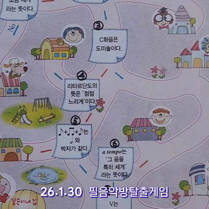 음악 방탈출 게임 이번 수업에서는 아이들이 정말 손꼽아 기다리던 음악 방탈출 게임을 진행했어요. 교실마다 문제를 붙여 놓고, 팀을 이루어 하나씩 해결해 나가는 방식이라 수업 시작 전부터 교실 분위기가 한껏 들떠 있었답니다. 방에 들어가면 바로 보이는 음악 문제들! 계이름, 박자, 리듬, 음악 기호 등 그동안 배웠던 내용을 총동원했어요. 아이들 표정은 진지했고, 서로 의견을 나누는 모습이 정말 인상적이었어요. 혼자였으면 어려웠을 문제도 “이건 내가 알 것 같아!”, “아니야 여기 다시 생각해 보자” 하며 팀원들과 함께 머리를 맞대니 어느새 문제 하나, 또 하나 해결해 나가더라고요. 문제를 풀고 다음 방으로 이동할....... <img src="https://phinf.pstatic.net/image.nmv/blog_2026_02_02_1310/G2tSqLbmO4_03.jpg?type=f480x480" />