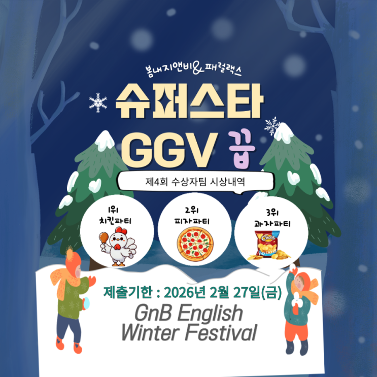 봄내지앤비 Winter Festival 슈퍼스타 ‘끕(Great GnB Video)’ 도전 안내 안녕하세요! 봄내지앤비 원장 비키입니다 우리 잰블리들의 개성과 표현력이 반짝이는 시간, 네 번째 ‘끕(Great GnB Video)’ 이벤트가 시작되었습니다✨ 이번 끕에서는 아이들이 그동안 지앤비에서 배운 내용을 바탕으로 직접 기획하고, 직접 표현하는 영상 미션에 도전합니다! 1. 교재 선택하기 영상 주제는 그동안 지앤비에서 학습한 교재 중에서 자유롭게 선택하면 됩니다. (라인업 교재, 스페셜 교재 모두 가능) ✔ 단, 현재 레벨보다 낮은 교재는 선택할 수 없어요. ✔ 나를 잘 표현할 수 있는 내용 ✔ 영상으로 재미있게 보여줄 수 있는 내용을 추....... <img src="https://blogthumb.pstatic.net/MjAyNjAxMjhfMjk1/MDAxNzY5NTg0MzY3MDE5.rFG6kmT42cTpVs0LGe_yHsYVhKkcuOf0gVu6YLFXVgcg.AEG5flSaJN6R6iZol7nZFWqKQklcx9BzvHjeLF088KUg.PNG/900%A3%DFBandPhoto%A3%DF2026%A3%DF01%A3%DF28%A3%DF16%A3%DF10%A3%DF09.png?type=s3" />