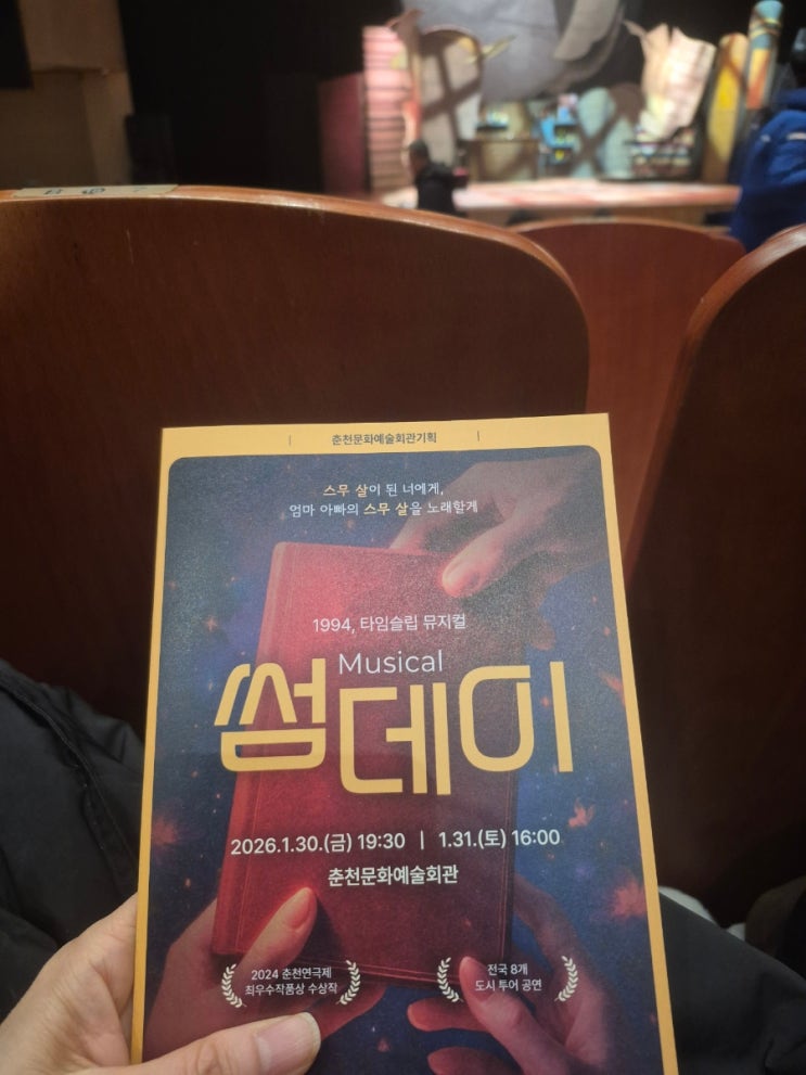 오랜만에 딸아이와 뮤지컬을 봤습니다 [썸데이]라는 극입니다 ㆍ 2024 춘천 연극제 수상작이며 전국 8개 도시를 투어하며 공연하는 극입니다ㆍ 20살 연수(김연수)는아빠(김이암)의 지나친 보호와 사랑을 간섭이라고 생각하며 힘들어합니다ㆍ 대학 역시 아빠가 반대하는 실용음악학과를 몰래 응시하고 오늘, 합격 소식을 듣습니다 불합격한 친구와 '썸데이'라는 바에서 난생처음 칵테일 한 잔을 마시고 잠이 든 연수는 20년 전이 1994년으로 타임슬립하게 됩니다ㆍ 연수가 잠에서 깬 '썸데이'에 이암(연수 아빠;20살)과 지혜(연수 엄마;20살)가 등장하고 그들이 20년 전의 자신의 부모임을 알게 됩니다 지혜와 이암의 첫사랑....... <img src="https://blogthumb.pstatic.net/MjAyNjAyMDFfNDgg/MDAxNzY5ODk4OTE0Mjkx.MxY2nh8J9okeoD8yCNZtLt3qFw_Ex1QgPR-JmvYvsAUg.ZRvvDwEzTHBBgV0J-duYqS6QAhFx3eWJ0SJ_FqDyL4Yg.JPEG/900%A3%DF20260131%A3%DF154241.jpg?type=s3" />
