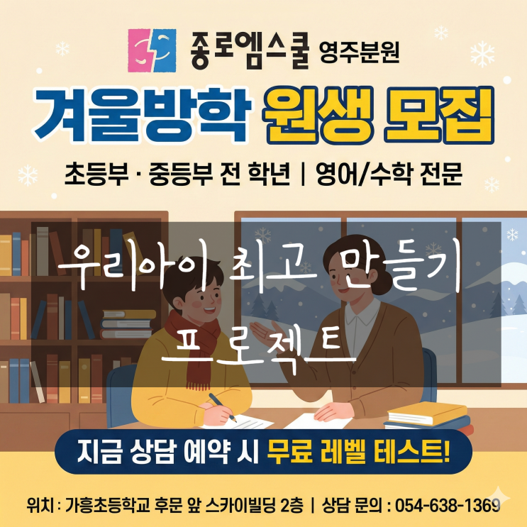[종로엠스쿨 영주학원] 가흥동 택지 가흥초 후문 앞 겨울방학 초등중등 1:1 밀착관리형 수학영어학원