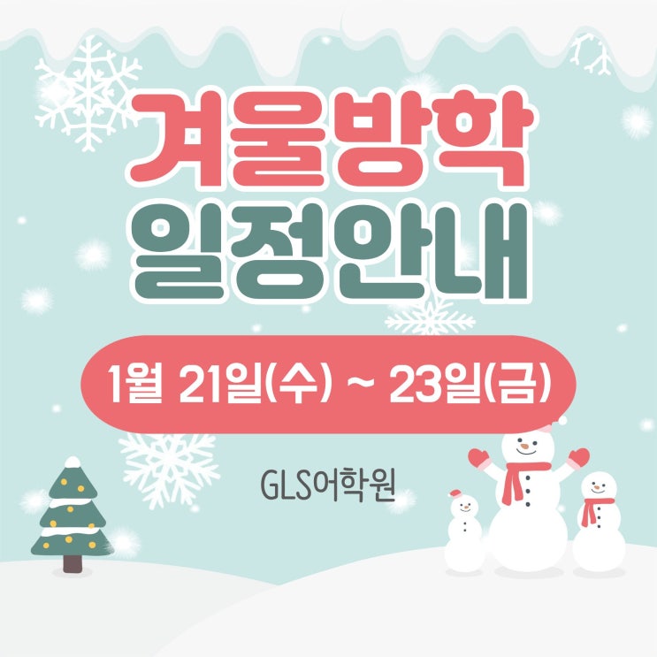 안녕하세요. GLS어학원입니다. 겨울이 깊어지며 한 해의 시작을 맞이한지도 한달 가까이 지나가고 있습니다. 추운 날씨 속에서도 늘 학원을 믿고 함께해 주셔서 진심으로 감사드립니다! 다가오는 겨울방학으로 인해 아래와 같이 학원 휴원이 예정되어 있어 안내드립니다. 겨울방학 기간 2026년 1월 21일(수) ~ 1월 23일(금) ✅ 정상 수업 재개일: 1월 26일(월)부터 기존 시간표대로 모든 수업이 정상 진행됩니다. [1월 24일(토) 예비고 토요특강 수업 정상 진행됩니다.] 추운 날씨에 건강 유의하시고, 이번 겨울방학동안 가족과 함께 따뜻한 시간 보내시길 바랍니다. 궁금한 점이나 문의사항이 있으시면 학원으로 연락 주세요. 학....... <img src="https://blogthumb.pstatic.net/MjAyNjAxMTlfMjYz/MDAxNzY4ODAyOTI0OTI4.4SpcrJeU04roBvSIHMDUVwcYuy5HJhnwlAXVZjae_sIg.SWlKzBtR0rcPOkHj0D1-fLUokhnDLESEJ71HrvZ4-ukg.JPEG/%B0%DC%BF%EF%B9%E6%C7%D0%BA%ED%B7%CE%B1%D7.jpg?type=s3" />