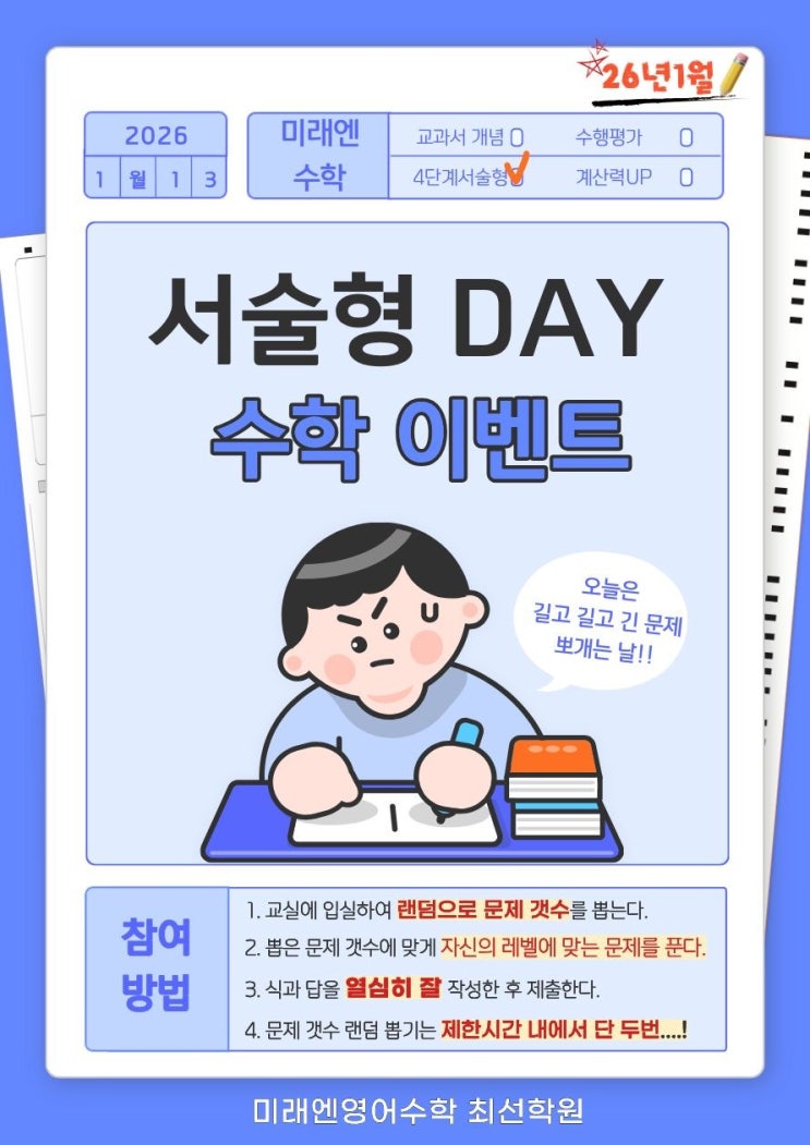 [1월 서술형 DAY 수학 이벤트 안내] 다가오는 1월 13일(화), 우리 아이들의 서술형 사고력 향상을 위한 「서술형 DAY 수학 이벤트」가 진행됩니다! 참여 방법 1️⃣ 교실에 입실하여 랜덤으로 문제 개수 뽑기 2️⃣ 뽑은 문제 수에 맞게 자신의 레벨에 맞는 문제 풀이 3️⃣ 식과 답을 꼼꼼하게 작성 후 제출 4️⃣ 제한 시간 내 집중! 기회는 단 두번!! 시상 안내 최다 문제 개수상 (2명) : 시간 내 가장 많은 문제를 푼 학생 완벽 정답상 (2명) : 가장 정확하게 풀이한 학생 태도상 (1명) : 가장 열심히 참여한 학생 시상 상품 : 베스킨라빈스 아이스크림 기프티콘을 상품으로 드립니다. 일시 : 2026년 1월 13일(화) 각자....... <img src="https://blogthumb.pstatic.net/MjAyNjAxMTJfMjEy/MDAxNzY4MjE3OTE3NDc3.AcXUhOmoR6uy57TWMOCplfXZp0APa0w0jT5uhnP9cbQg.J0F3Wnrk27hjwCROk1DGqH3xNQ2PxnUChNN7MvH2wuYg.JPEG/BandPhoto%A3%DF2026%A3%DF01%A3%DF12%A3%DF20%A3%DF14%A3%DF55%A3%DF1.jpg?type=s3" />