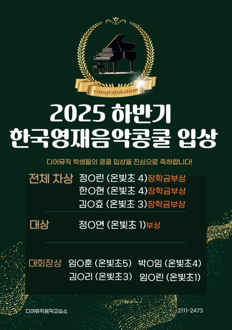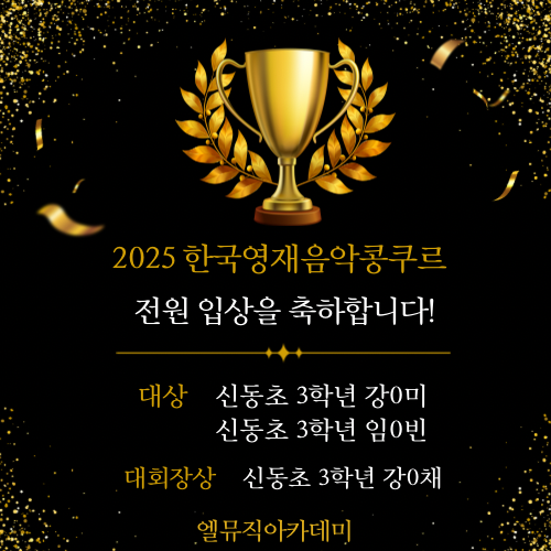 안녕하세요 ! 엘뮤직아카데미에서 정말 기쁜 소식을 전해드립니다. **〈2025 하반기 한국 영재 콩쿠르〉**에 엘뮤직아카데미 학생들이 참가해 전원 입상이라는 값진 성과를 거두었습니다 아이들의 노력과 꾸준한 연습, 그리고 그 과정을 함께한 시간들이 무대 위에서 아름답게 빛난 순간이었습니다 2025 하반기 한국 영재 콩쿠르 수상 결과 대상 신동초 3학년 강○미 신동초 3학년 임○빈 대회장상 신동초 3학년 강○채 모든 학생들이 자신의 음악을 끝까지 집중력 있게 표현하며 심사위원분들께 좋은 평가를 받았습니다. 심사평으로 증명된 아이들의 성장 이번 콩쿠르에서는 단순한 결과보다도 과정 속에서의 성장이 더....... <img src="https://blogthumb.pstatic.net/MjAyNTEyMjRfMTkx/MDAxNzY2NTQzODM2Mjkx.z054J2vcpO3jWUgcnYTVmDRQmY45qb49hfF8MSg28Fkg.byyt-XiAt_XjpP8tsGwD81fuyeGfrRsPYZR4DgUNazAg.PNG/image.png?type=s3" />
