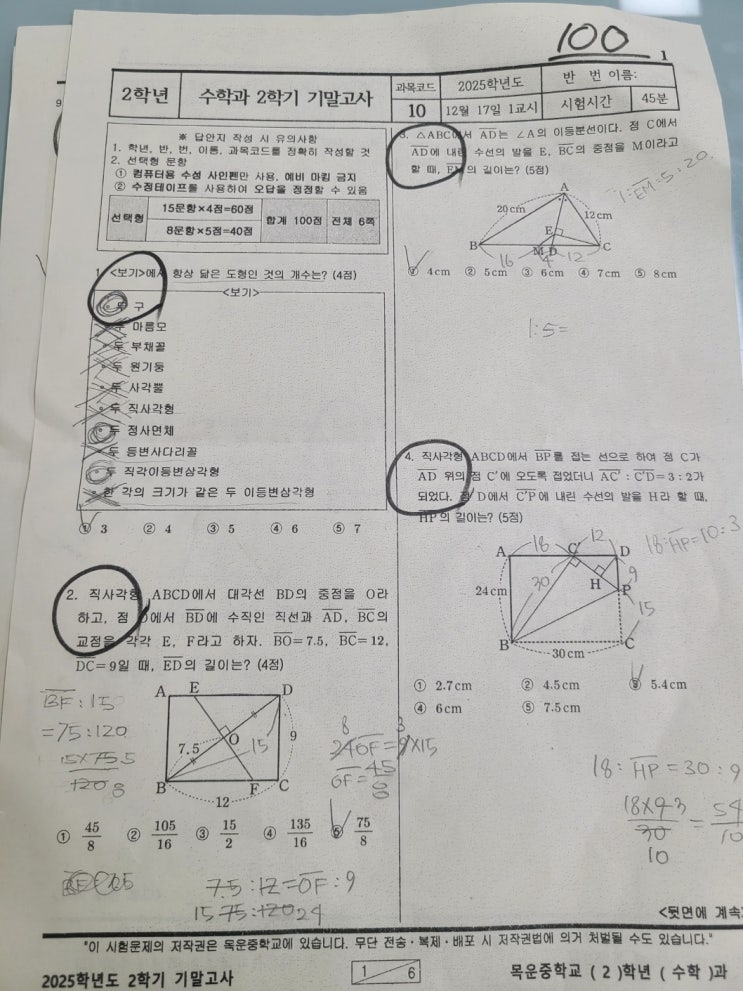 우리 학원에서는 특별한 일이 아닙니다 중학교 2학년 2학기 기말고사 수학 100점. 시험지를 처음 보셨다면 놀라실 수 있습니다. 하지만 목동에서 우리 학원을 다니는 학생에게 이 결과는 우연도, 일회성 성과도 아닙니다. 이 점수는 잘해서 나온 결과라기보다, 준비된 과정의 결과입니다. ✔ 6장 전부, 감점 없는 100점 이번 시험지는 중2에서 자주 실수하는 유형 서술형에서 감점이 많은 문항 시간 관리가 까다로운 문제 가 고르게 포함된 시험이었습니다. 그럼에도 ✔ 계산 실수 없음 ✔ 풀이 흐트러짐 없음 ✔ 서술형 감점 없음 이 결과는 특별한 재능이 아니라, 관리의 힘이라고 생각합니다. ✔ “원래 잘하는 아이였나요?” 많이 받는....... <img src="https://blogthumb.pstatic.net/MjAyNjAxMTRfMjQ4/MDAxNzY4MzUxNDk4OTA0.8zBSDV1VCaRi8nmi7HkuQFwGQ3_dx7Gtgtnpiz1V7VUg.FvySdn_xDqBkge9AlsSRm2ug5Crd1e-ytLCnDjmvUx0g.JPEG/KakaoTalk_Photo_2026-01-14-09-04-49_001.jpeg?type=s3" />