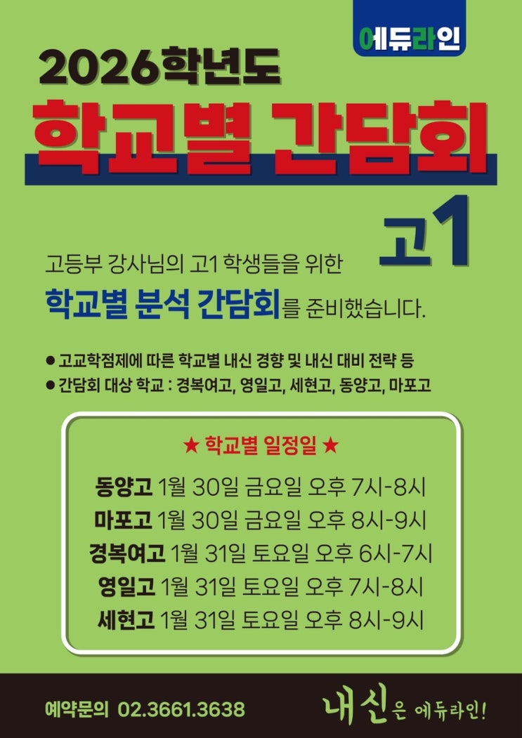 고1을 위한 고교별 분석 간담회 개최 안내 : 동양고 마포고 세현고 경복여고 영일고